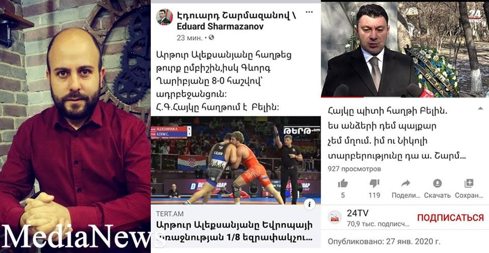 ՀՀԿ խոսնակ Էդուրադ Շարմազանովն անդրադառնալով Հռոմում ընթացող ըմբշամարտի Եվրոպայի առաջնությունում մեր ըմբիշների՝ Արթուր Ալեքսանյանի և Գևորգ Ղարիբյանի թուրք և ադրբեջանցի մարզիկների նկատմամբ տարած հաղթանակներին (առաջին լուսանկարում), իր ֆեյսբուքյան էջում մասնավորապես գրել է․ Արթուր Ալեքսանյանը հաղթեց թուրք ըմբիշին,իսկ Գևորգ Ղարիբյանը 8-0 հաշվով՝ ադրբեջանցուն։
