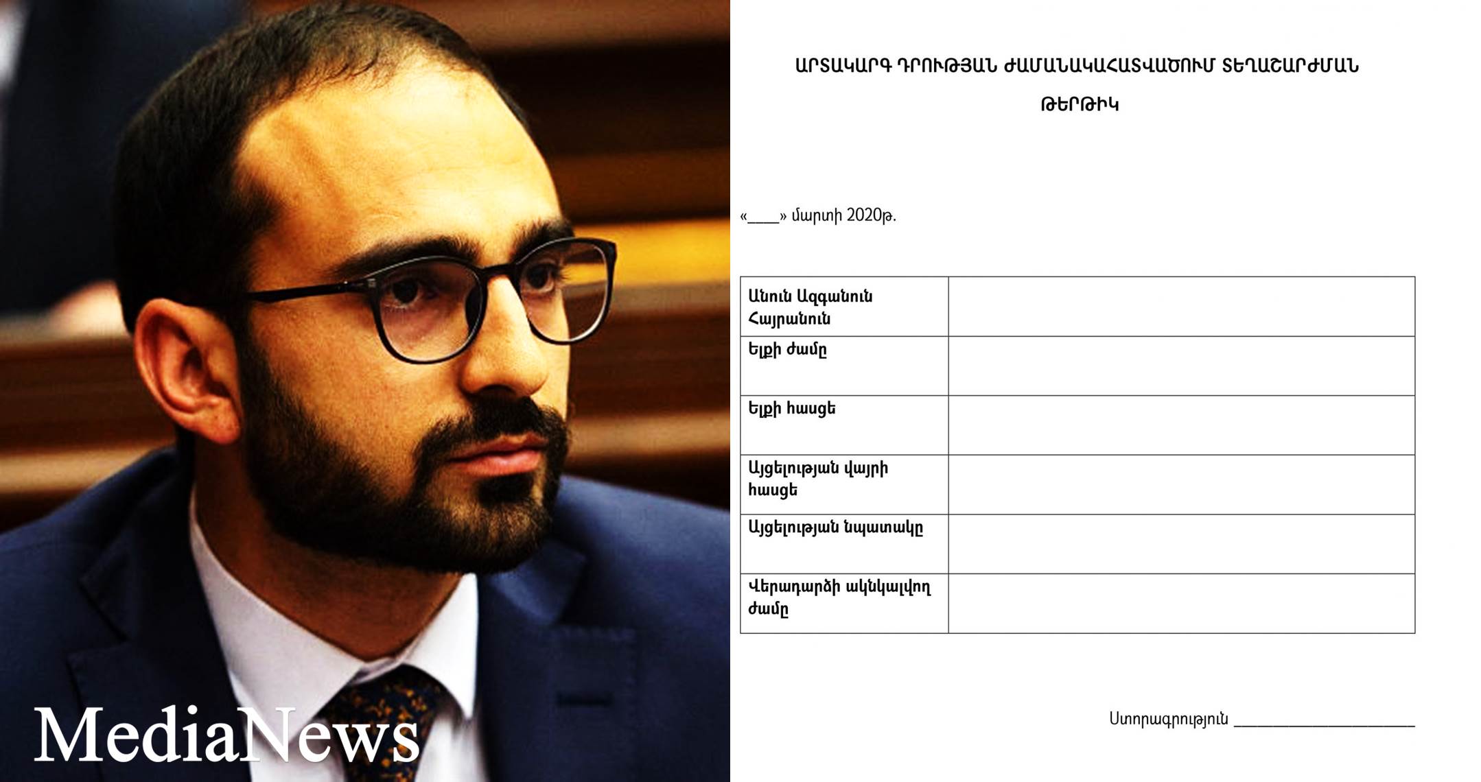 «Անմիջական շփումների բացառման և վարակի կանխարգելման նպատակով Ոստիկանությանը ցուցում է տրվել, որպեսզի մեր քաղաքացիների տեղաշարժման թերթիկը և անձնագիրը/նույնականացման քարտը ստուգելիս չվերցնեն փաստաթղթերը, այլ խնդրեն որ քաղաքացիներն իրենք ցույց տան դրանք: