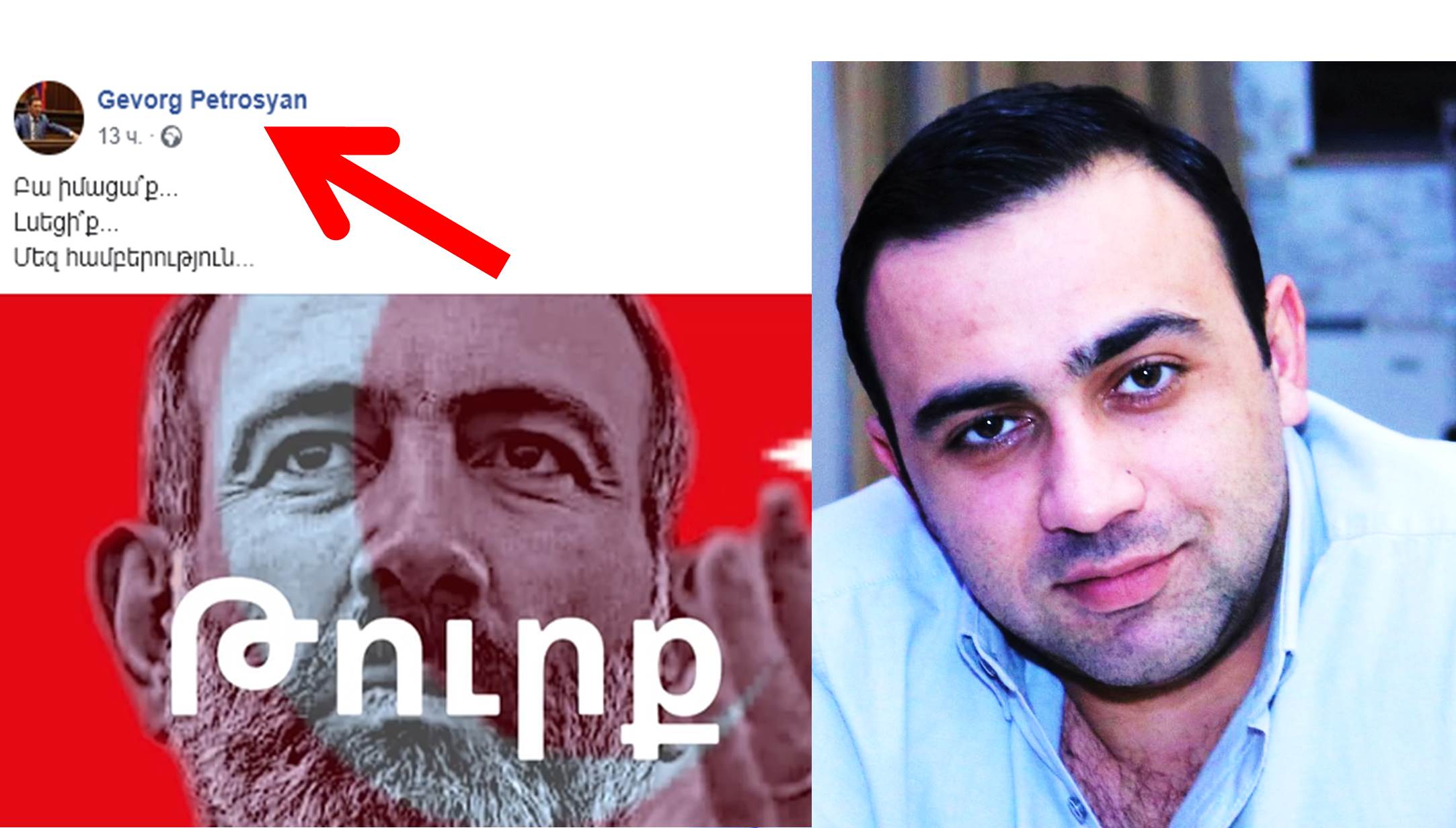 Հիշեցնենք, որ ավելի վաղ ԱԺ պատգամավոր Գևորգ Պետրոսյանն իր ֆեյսբուքյան էջում կիսվել էր մոնտաժված տեսանյութով, որն ակնհատ հակապետկան քարոզչության նպատակ էր հետապնդում: