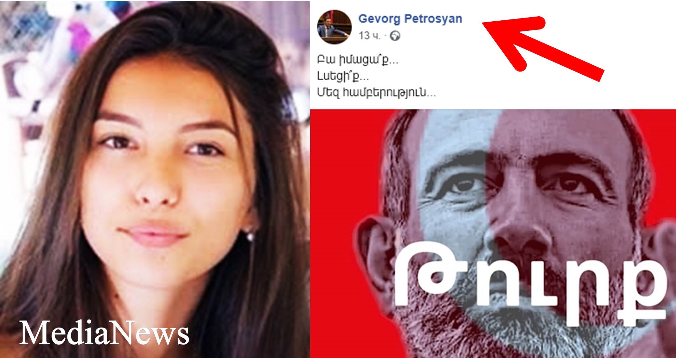 ՀՀ վարչապետի նկարը թուրքական դրոշով զետեղել իր էջում ու անվանելով նրան թուրք և իրեն լավ զգալ կարող է միայն թուրքը ու ազերին պարոն Պետրոսյան։ Հիմա խորհուրդ կտայի Ձեր անձը ենթարկեիք գենետիկ հետազոտության և շտապ հանրությանը տեղյակ պահեիք Ձեր իսկական ազգության մասին։ Եթե պարզվի, որ թուրք եք ու այսքան ժամանակ հայ եք ձևացել ու մասնակցություն եք ունեցել պետության խարխլման գործընթացին՝ ապա շտապ հարկավոր է ժողովրդի թեթև ձեռքով թուրքական դրոշը դրոշմել Ձեր անամոթ ճակատին ու աքսորել Ձեր իսկական հայրենիք!!!