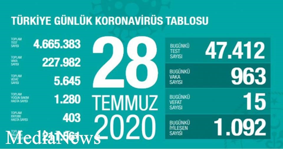 Թուրքիայում հուլիսի 28-ին կորոնավիրուսից (Covid-19) մահացել է 15 մարդ։ Այդ մասին «Twitter» միկրոբլոգի իր պաշտոնական էջում հայտնել է Թուրքիայի առողջապահության նախարար Ֆահրեթթին Քոջան։