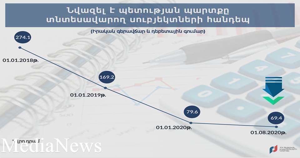 Պետական եկամուտների կոմիտեն տեղեկացնում է, որ 2020 թվականի օգոստոսի 1-ի դրությամբ պետության պարտքը տնտեսավարող սուբյեկտներին նվազել է 70 մլրդ դրամի շեմից՝ կազմելով 69,4 մլրդ դրամ: Այս մասին հաղորդում են ՊԵԿ-ից։