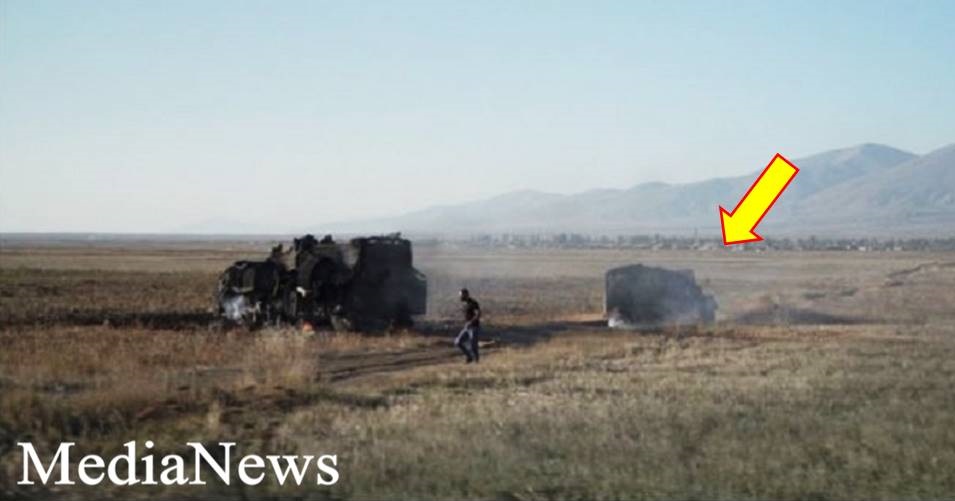Օպերատիվ-մարտավարական հրթիռային կայանքի մոխրացած կմախքը շարունակել է ծխալ Սոթք գյուղից Վարդենիս քաղաք տանող ճանապարհի կողքի դաշտում, երբ այնտեղ են հայտնվել բրիտանացի լրագրողները: