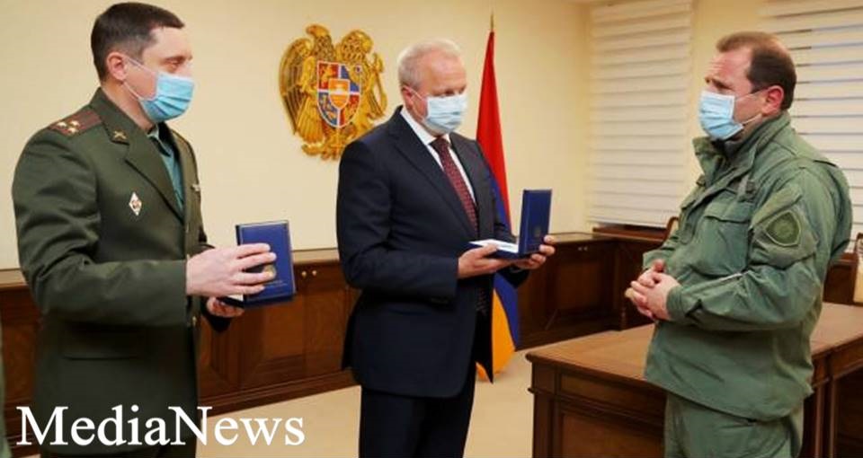 ՀՀ պաշտպանության նախարար Դավիթ Տոնոյանը հերթական անգամ ցավակցական խոսքեր է ուղղել ՌԴ դեսպանին՝ ՀՀ տարածքում Մի-24 ուղղաթիռի խոցման արդյունքում ՌԴ զինծառայողների զոհվելու կապակցությամբ և Սերգեյ Կոպիրկինին փոխանցել մայոր Յուրի Իշչուկին (հետմահու), ավագ լեյտենանտ Ռոման Ֆեդինին (հետմահու) և ավագ լեյտենանտ Վլադիսլավ Գրյազինին Մարտական ծառայության մեդալով պարգևատրելու մասին ՀՀ նախագահի հրամանագրերը և պարգևները: