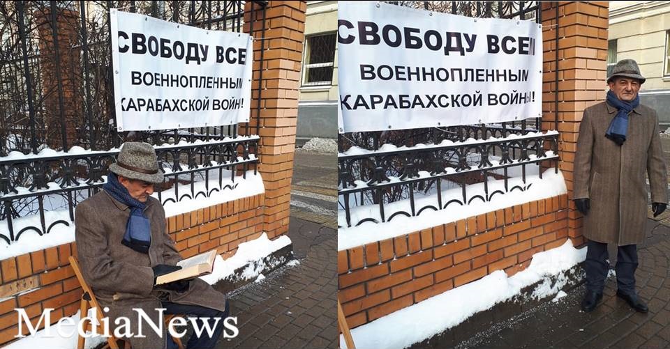 Մոսկվայաբնակ Գրիգոր Կեցյանը Ադրբեջանի դեսպանատան դիմաց նստացույց է արել՝ հայ ռազմագերիների ազատության պահանջով։