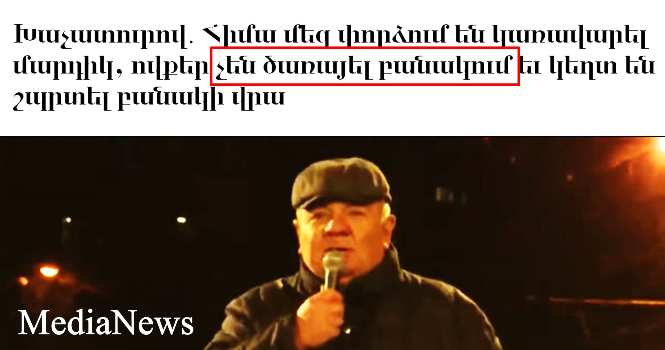 Երեւանի Բաղրամյան պողոտայում կայացած հանրահավաքի ժամանակ գեներալ-գնդապետ, ՀԱՊԿ նախկին գլխավոր քարտուղար Յուրի Խաչատուրովը մեծ-մեծ բրդում էր, թե «Հիմա մեզ փորձում են կառավարել մարդիկ, ովքեր չեն ծառայել բանակում եւ կեղտ են շպրտել բանակի վրա»։