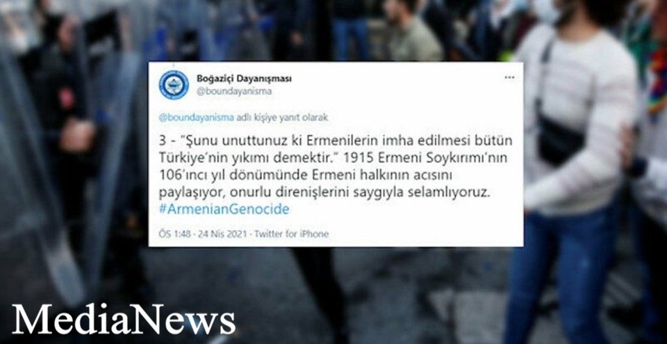 Ստամբուլի Բողազիչի համալսարանի «Dayanışma» (Համերաշխություն) խումբը Twitter-ում Հայոց ցեղասպանության 106-րդ տարելիցի կապակցությամբ արել է գրառում, որը մեծ աղմուկ է բարձրացրել թուրք օգտատերերի շրջանում, փոխանցում է Ermenihaber-ը։