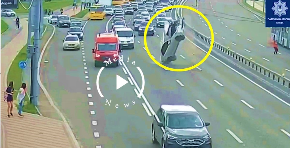 Կիևում հետաքրքիր դեպք է տեղի ունեցել ճանապարհին. Ավտոմեքենաներից մեկը հանկարծ օդ է բարձրացել, որից հետո կտրուկ վայր ընկել և կողաշրջվել։
