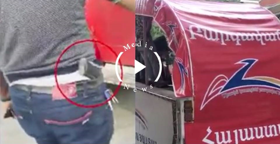 Այս բանավեճի ընթացքում մեր տեսախցիկն արձանագրեց, որ տվյալ անձը զենք է կրում գոտկատեղին, ընդ որում ամեն կերպ փորձելով այն ի ցույց դնել: Հասկանալով, որ զենքն ենք նկարում, նա գրպանից հանեց ինչ-որ վկայական՝ ասելով, որ զենքն օրինական է: Նկարելով նաեւ վկայականը, ըստ որի վրա առկա տվյալների տվյալ անձը Գարեգին Լոպոյանն էր, մտնում էինք խմբագրություն, երբ ԲՀԿ ներկայացուցիչը սկսեց սադրել՝ մեր ետեւից բղավելով «հող հանձնողներ», «էսօր էլի գերի եք տվել», «ադրբեջանցիներ» եւ այլն: