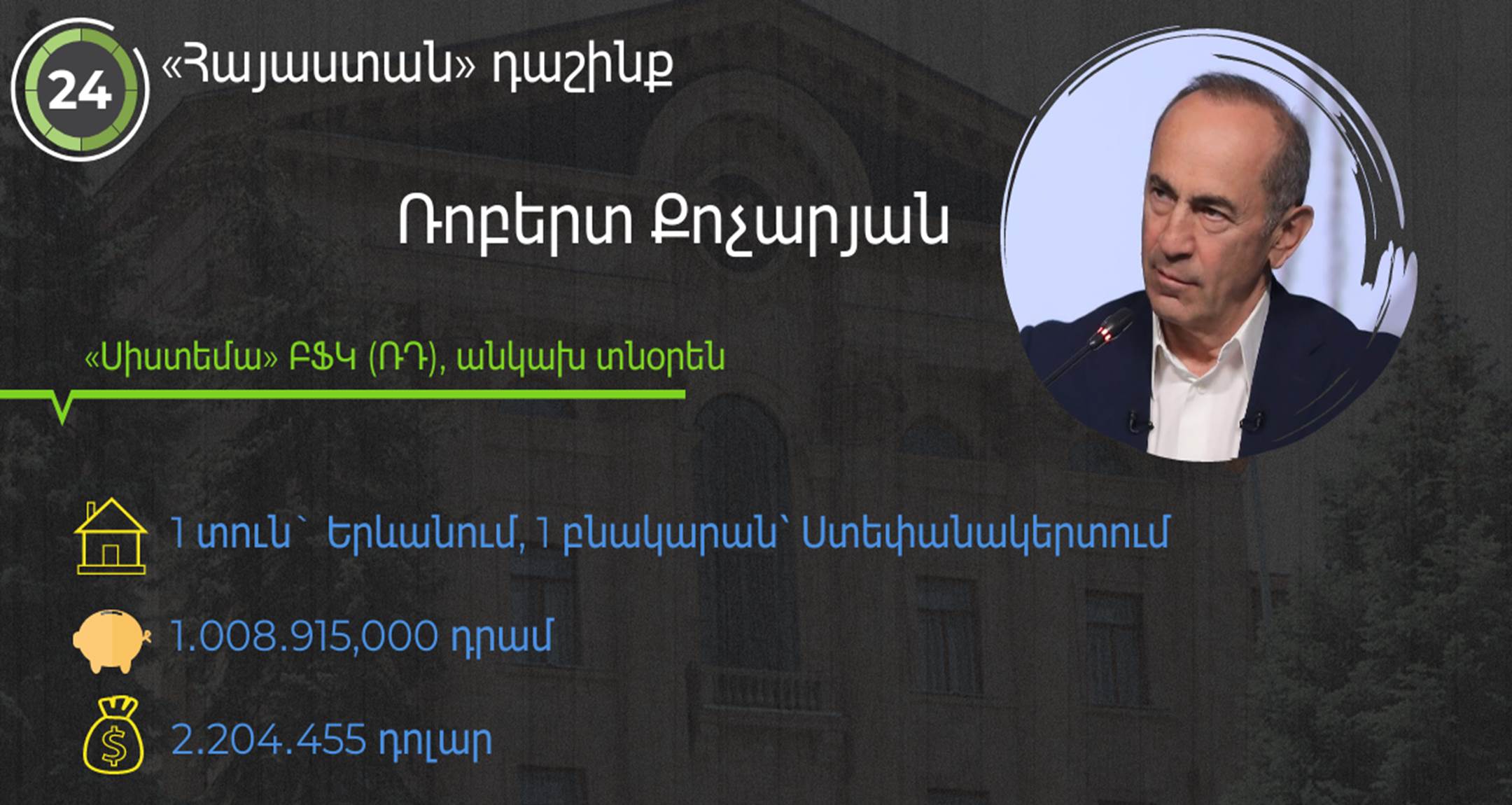 Ընտրություններին 24-րդ համարի տակ հանդես եկող «Հայաստան» դաշինքը գլխավորում է ՀՀ 2-րդ նախագահ Ռոբերտ Քոչարյանը։