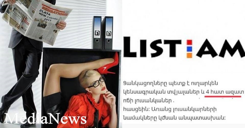 Վերոգրյալի ապացույցն են Էլեկտրոնային «List.am» հայտարարությունների առցանց հարթակում՝ «աշխատանք» բաժնում, սեւով սպիտակի վրա գրված տեքստերը: Մեջբերում ենք բառացի՝ «Կազմակերպության ղեկավարին անհրաժեշտ է անձնական քարտուղարուհի: Կարող են դիմել մինչեւ 35 տարեկան անկաշկանդ, շփման մեջ բաց, առանց կոմպլեքսների, ազատամիտ կանայք ու աղջիկներ»: Կնոջն ապրանքացնելու առավել հստակ օրինակ, քան «անձնական քարտուղարուհի» եզրույթն է, երեւի թե այլ պարագայում հնարավոր էլ չէ գտնել: