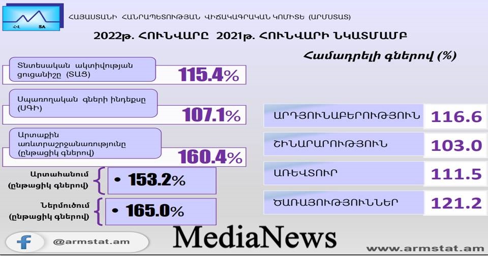 ՀՀ սոցիալ-տնտեսական վիճակը բնութագրող ընթացիկ-օպերատիվ ամփոփմամբ ստացված նախնական հիմնական մակրոտնտեսական ցուցանիշները 2022թ. հունվարին (2022թ. փետրվարի 25-ի դրությամբ)։