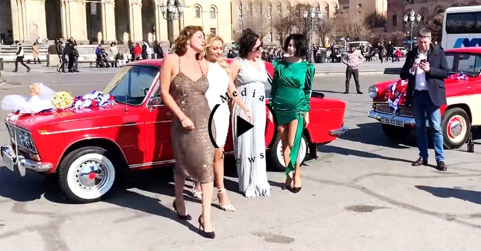 Հարսն ու փեսան հյուրերի հետ սովետական ավտոմեքենաներով են հասել Հանրապետության հրապարակ։