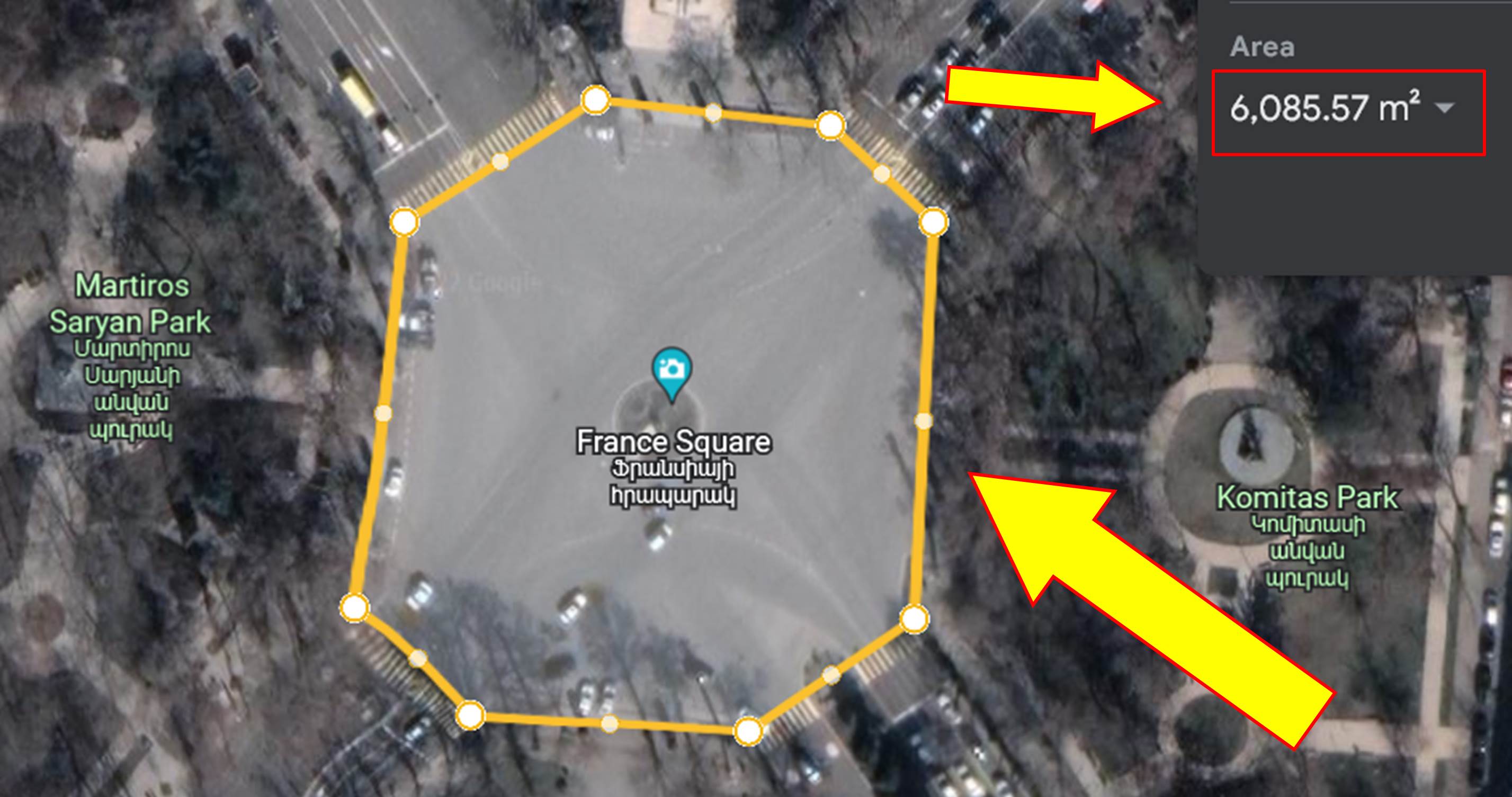 Լուսանկարում Ֆրանսիայի հրապարակն է։ Ըստ Google Earth-ի Ֆրանսիայի հրապարակի մակերեսը մոտ 6000 քառակուսի մետր է։