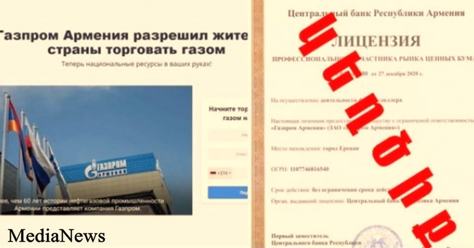 Բացի այդ, «Գազպրոմ Արմենիա» ՓԲԸ-ն արժեթղթերի շուկայում որևէ գործունեություն չի իրականացնում։ Կեղծ կայքերում զետեղված ցանկացած արտոնագիր, վկայագիր, հավաստագիր կամ նմանատիպ այլ «փաստաթուղթ», որում հիշատակված է Ընկերության անվանումը հանդիսանում է կեղծիք, որի օրինակը ներկայացվում է ստորև։