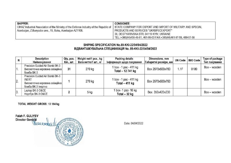 Առկա փաստաթղթային ապացույցները ցույց են տալիս, որ Ադրբեջանը 2022 թվականի ապրիլին գաղտնի զինամթերք է մատակարարել ուկրաինացի զինվորականներին։