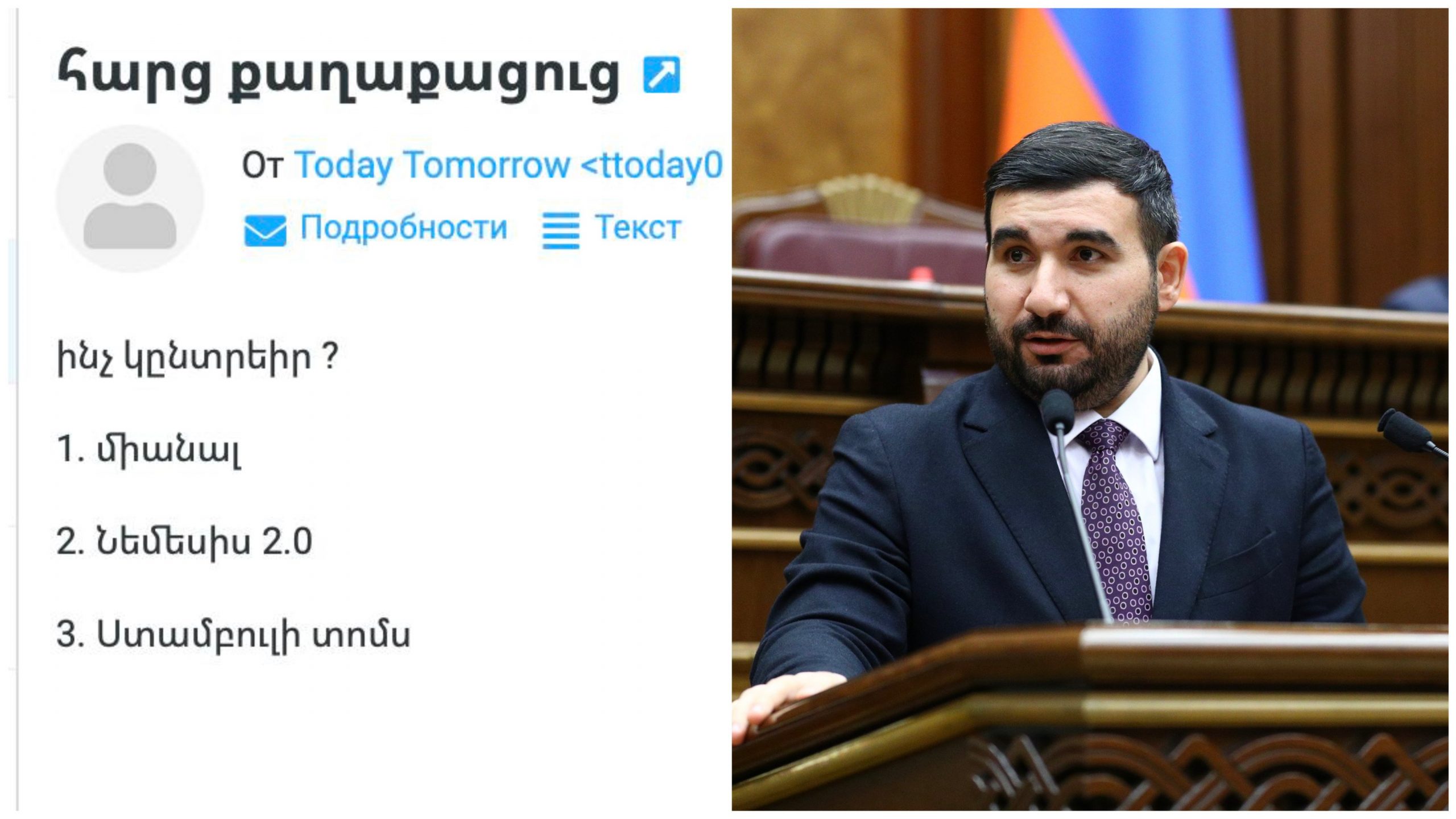«Երեխեք ջան, եթե ձեզ թվում է, թե Նաիրի Հունանյանը ինչ-որ այլ ուղի է անցել, քան կոնկրետ էն մարդկանց հետ մտերմիկ ու «գաղափարական» շփումը, որոնք էսօր հրապարակում ստվերային «շարժում» են համակարգում, դուք սխալվում եք։ YouTube-ում կադրերը կան, հանգիստ նայեք։