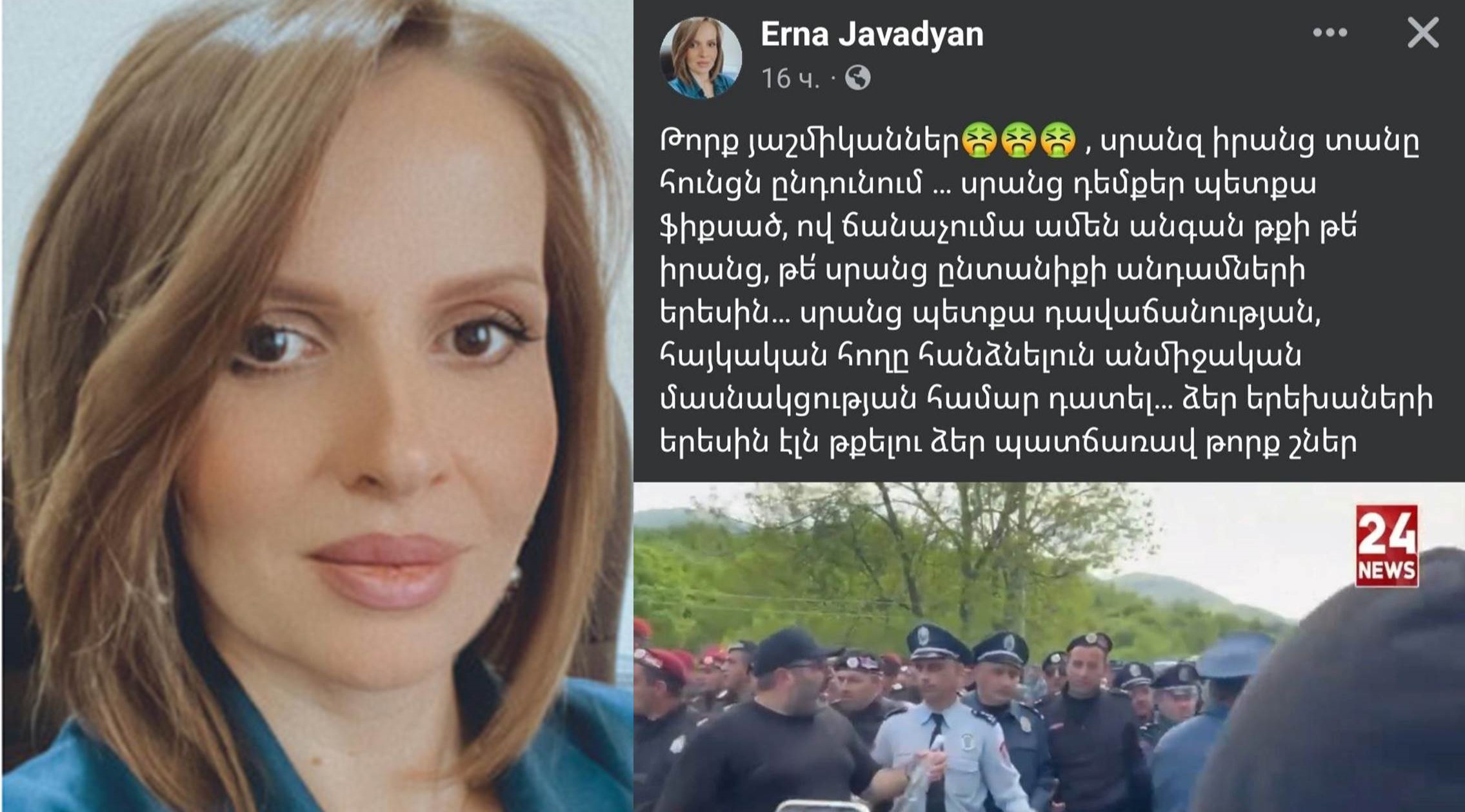Դեռևս 2021 թվականից Հայաստանի ներքաղաքական կյանքին խառնվող ու Լեռնային Ղարաբաղից մարդկանց Ռոբերտ Քոչարյանի հանրահավաքներին ավտոբուսներով բերող Ստեփանակերտի քաղաքապետի կինը՝ Էռնա Ջավադյանը իր ֆեյսբուքյան էջում գրառում է արել, որտեղ վիրավորել ոստիկաններին և կոչ է արել հետապնդել նրանց ընտանիքի անդամներին.