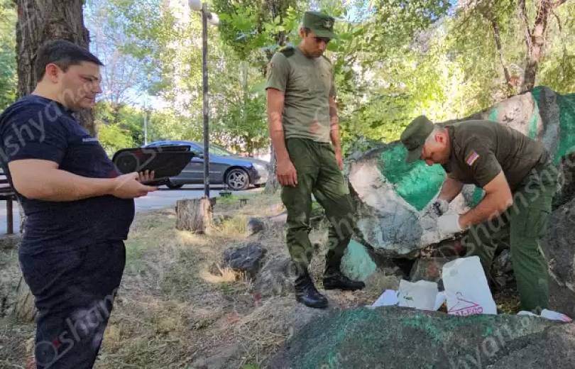 Դեպքի վայր ժամանած ոստիկանության Նոր Նորքի բաժնի ծառայողները որոնողական աշխատանքների արդյունքում այգում հայտնաբերել են կասկածելի պարկը։ Փրկարար ծառայության սակրավորները վնասազերծել են պարկը, որում առկա է եղել 65 հատ 5, 45, 26 հատ 7․62 տրամաչափի փամփուշտ, 1 հատ ինքնաշեն թմբուկավոր ատրճանակ, 1 հատ РГД-7 նռնակ և 1 հատ ծխաձայնային նռնակ, իրենց պայթուցիչներով և հանձնել ոստիկաններին։