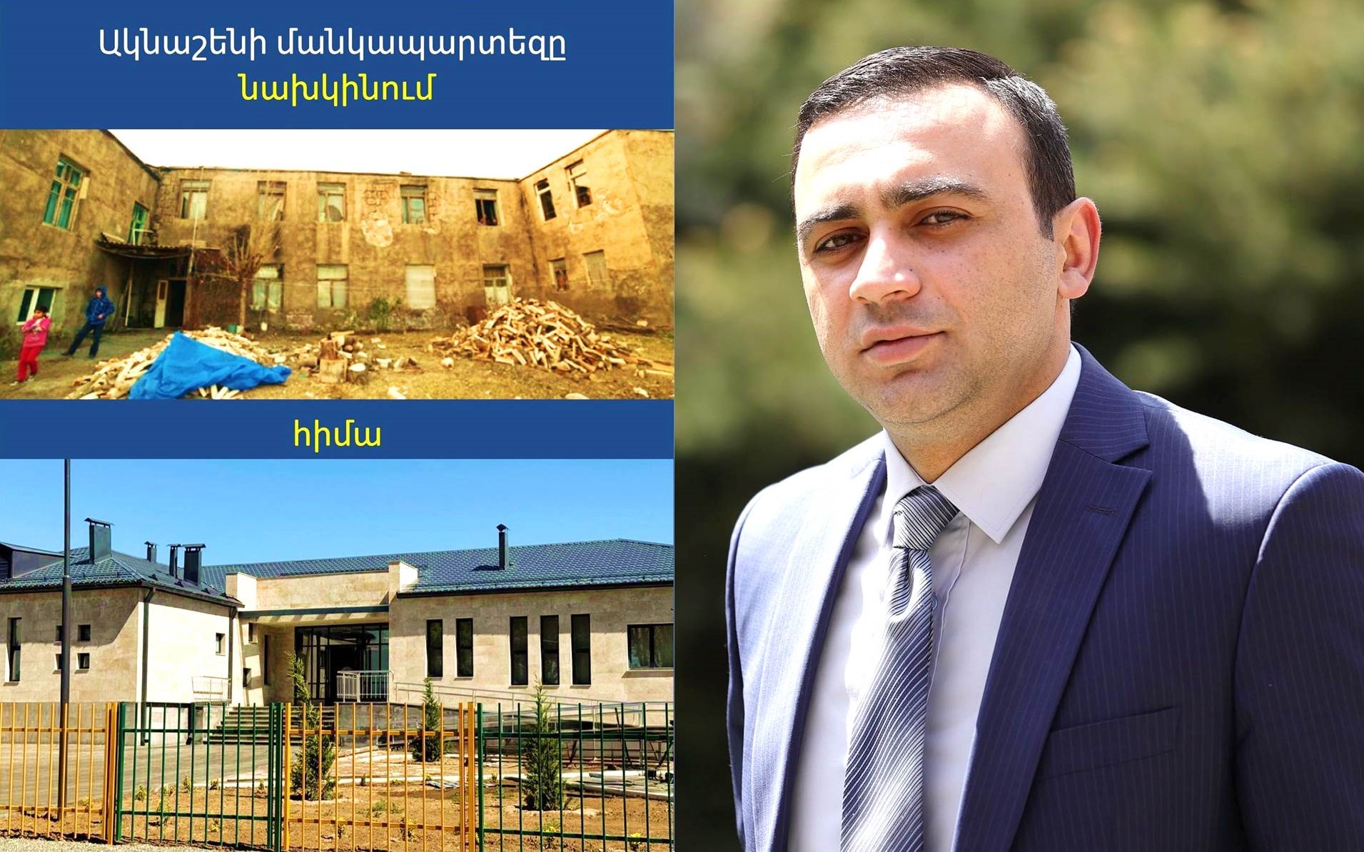 ՀՀ վարչապետի աշխատակազմի ղեկավարի տեղակալ Տարոն Չախոյանը սոցցանցի իր էջում հրապարակել է Ակնաշենի նորակառույց մանկապարտեզի նախկին և ներկա լուսանկարներն ու գրել.