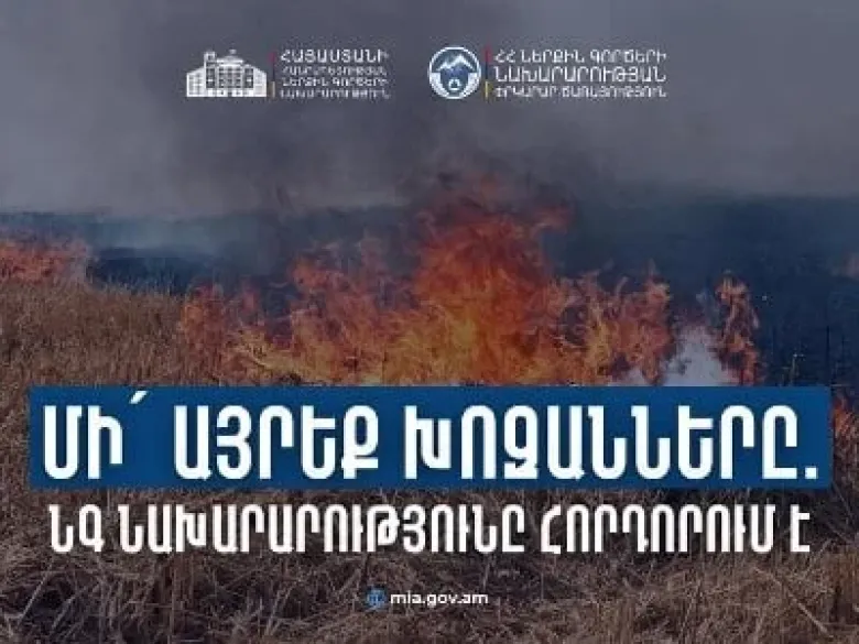 Ներքին գործերի նախարարությունը հորդորում է համայնքների բնակիչներին արոտավայրերում չոր խոտերի և ցանքատարածքների մաքրման ընթացքում խուսափել այրումներից, չառաջացնել լրացուցիչ հրդեհավտանգ իրավիճակներ։