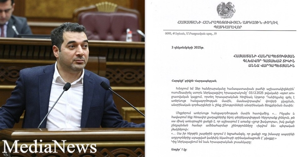 «Երեկ դիմում եմ ներկայացրել Գլխավոր դատախազություն՝ ուսումնասիրելու «aysor.am» լրատվական կայքում հրապարակված Արթուր Դանիելյանի գրառումը՝ առերևույթ հանցագործության մասին, մասնավորապես՝ փողերի լվացման, անօրինական գործարքների և շենք-շինությունների անօրինական ձեռքբերման վերաբերյալ»։