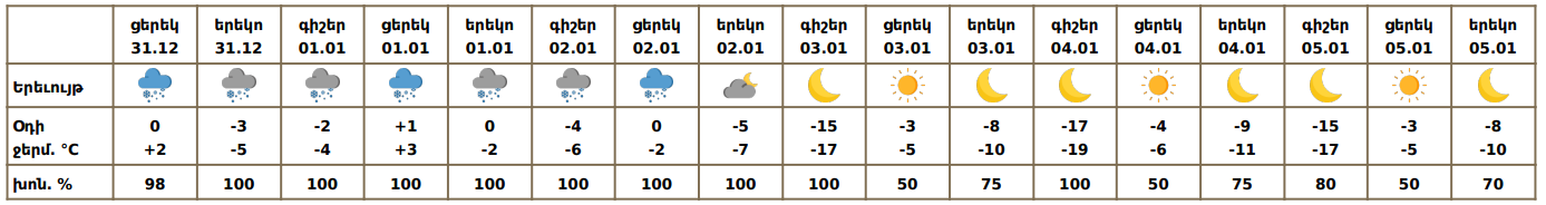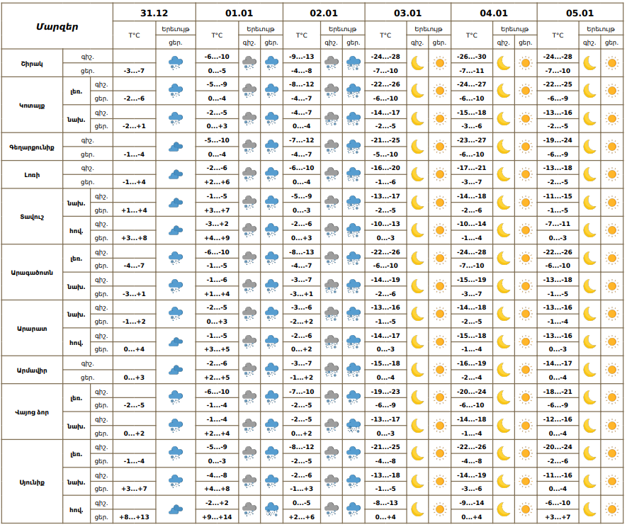 Երևան քաղաքում դեկտեմբերի 31-ի ցերեկը, հունվարի 1-2-ին սպասվում է ձյուն: Հունվարի 3-5-ին սպասվում է առանց տեղումների եղանակ: