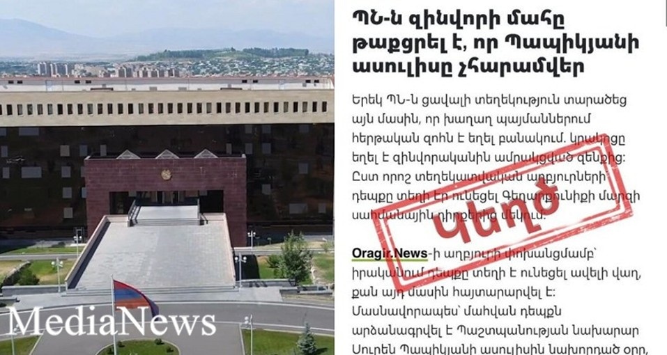 ՀՀ պաշտպանության նախարարությունը հերքել է մամուլում հայտնված հերթական հրապարակումն այն մասին, թե ՊՆ-ն, իբր, դիտավորյալ թաքցրել է զինվորի մահը՝ նախարար Պապիկյանի «ասուլիսը չհարամելու» համար: