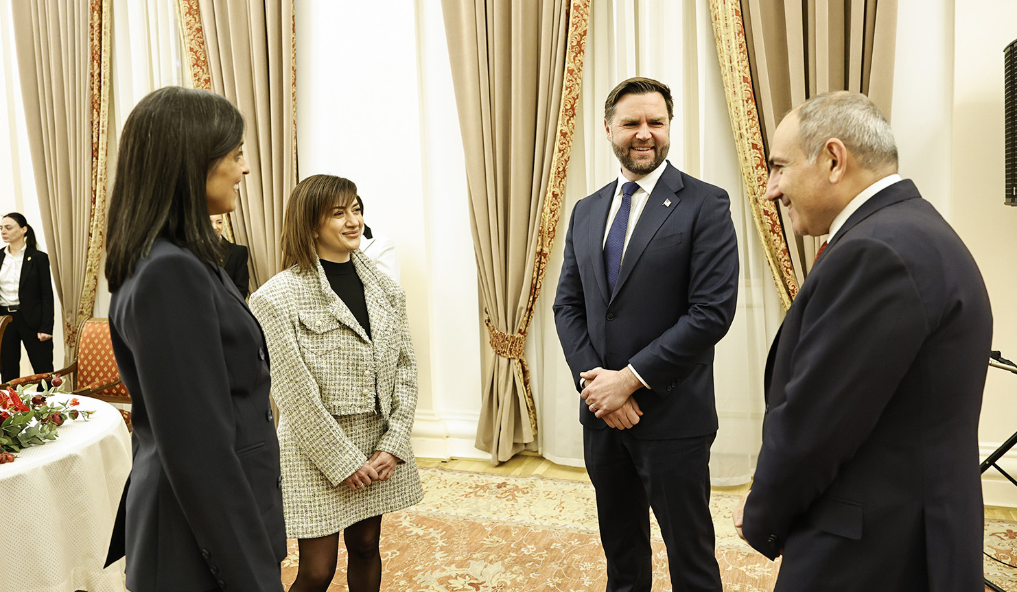 ՀՀ վարչապետ Նիկոլ Փաշինյանն ու տիկին Աննա Հակոբյանը հյուրընկալել են պաշտոնական այցով Հայաստանում գտնվող Ամերիկայի Միացյալ Նահանգների փոխնախագահ Ջեյ Դի Վենսին և տիկնոջը՝ Ուշա Վենսին։