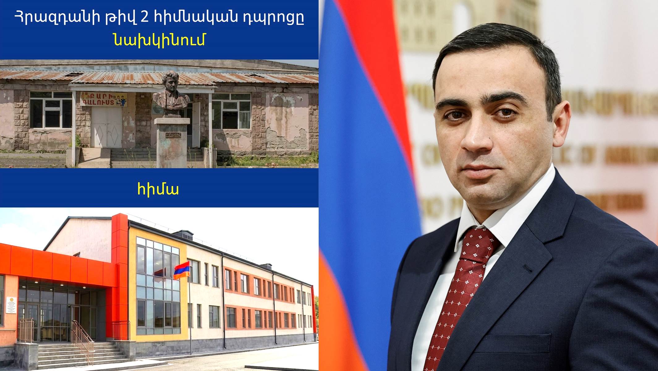 Հրազդանում վթարային կարգավիճակ ունեցող թիվ 2 հիմնական դպրոցի շենքի փոխարեն կառուցվել է նորը։ Նորակառույց սեյսմակայուն դպրոցի շենքը նախատեսված է 432 աշակերտի համար։