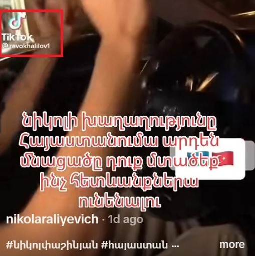 Տեսանյութում երևում է, որ վարորդը ադրբեջանական երգի ներքո երթևեկում է հայկական համարանիշերով ավտոմեքենայի հետևից։ Panorama.am-ի հրապարակած տեսանյութը վերցված է Տիկտոկ սոցիալական ցանցից՝ @nikolaraliyevich օգտատիրոջ էջից։ Դրա վրա գրված է՝ «Նիկոլի խաղաղությունը Հայաստանում ա, արդեն մնացածը դուք մտածեք՝ ինչ հետևանքներ ա ունենալու»:
