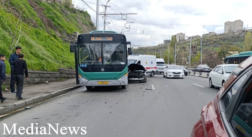 Երևանի Մյասնիկյան պողոտայում «Մերսեդես» մակնիշի ավտոմեքենան հարվածել է թիվ 53 երթուղին սպասարկող կայանված ավտոբուսին: