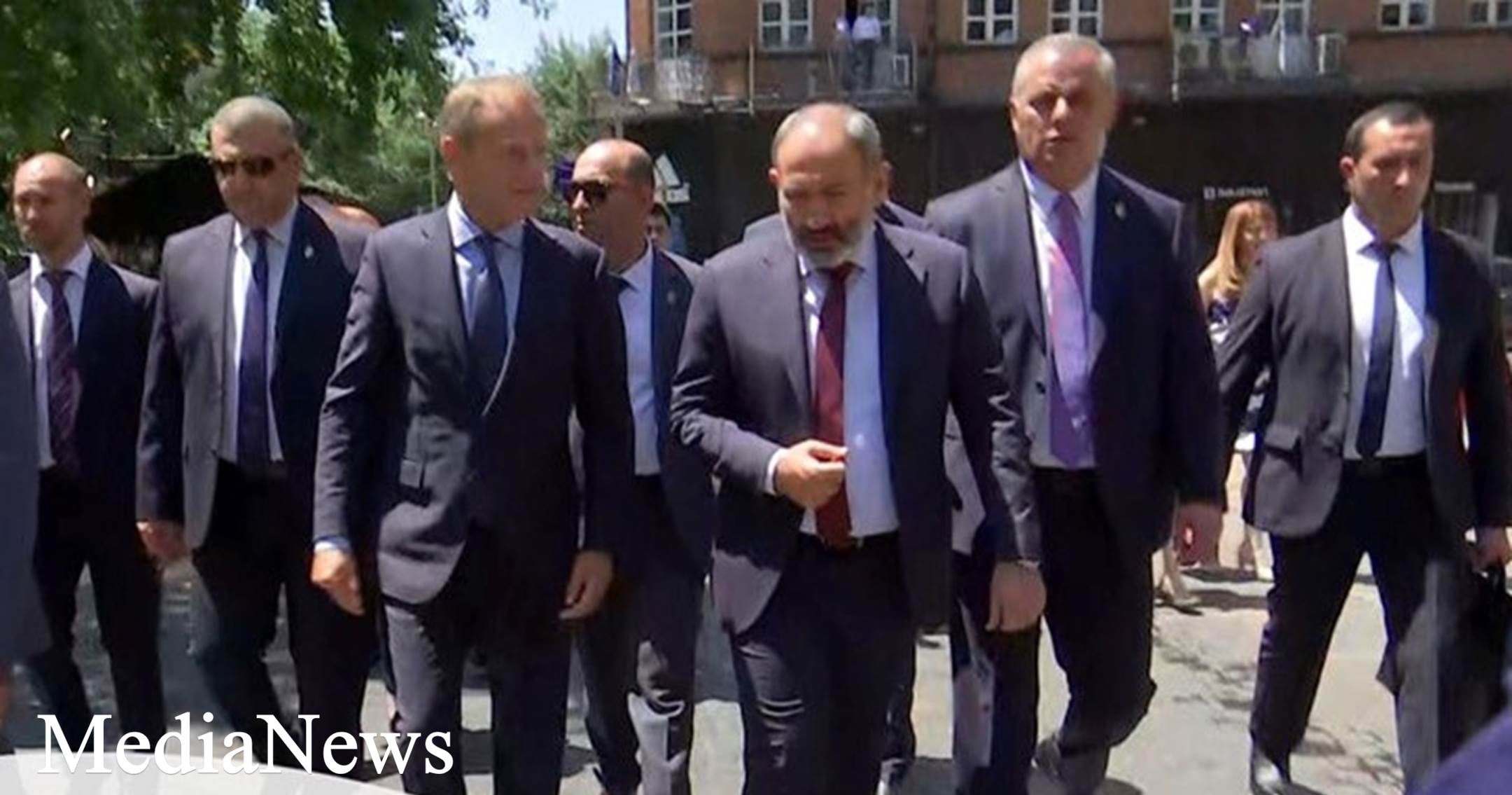 Համատեղ ասուլիսից հետո ՀՀ վարչապետ Նիկոլ Փաշինյանը Եվրոպական խորհրդի նախագահ Դոնալդ Տուսկի հետ դուրս է եկել կառավարության շենքից և զբոսնել Հանրապետության հրապարակում: